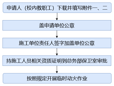 1.下载附件文件,详细填写相关信息内容,将《临时动火作业承诺书》及《临时动火作业审批表》正反面打印(一式四份,保卫室、申请单位、物业、施工单位各执一份),相关责任人签字盖章后,连同施工人员相关资质证明材料,至少于动火作业前一天送至总务部保卫室(H03楼-313室)。