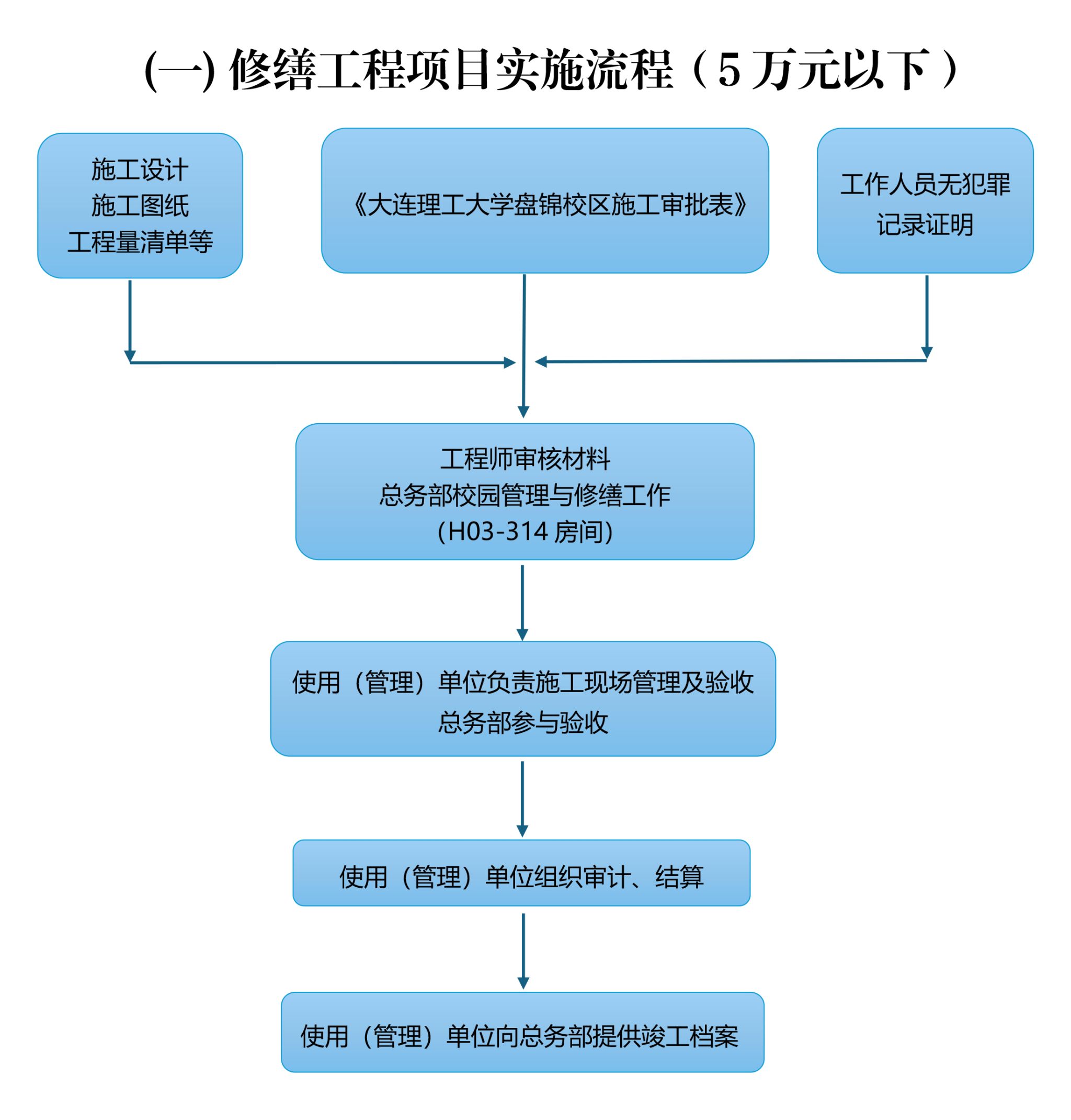 1.工程预算5万元以下项目,使用(管理)单位可自行组织实施,实施前需向总务部提交《大连理工大学盘锦校区施工审批表》(附件3),由总务部专业工程师审核施工方案后方可施工,工程竣工后总务部参与工程验收工作,使用(管理)单位按要求向总务部提供竣工档案;