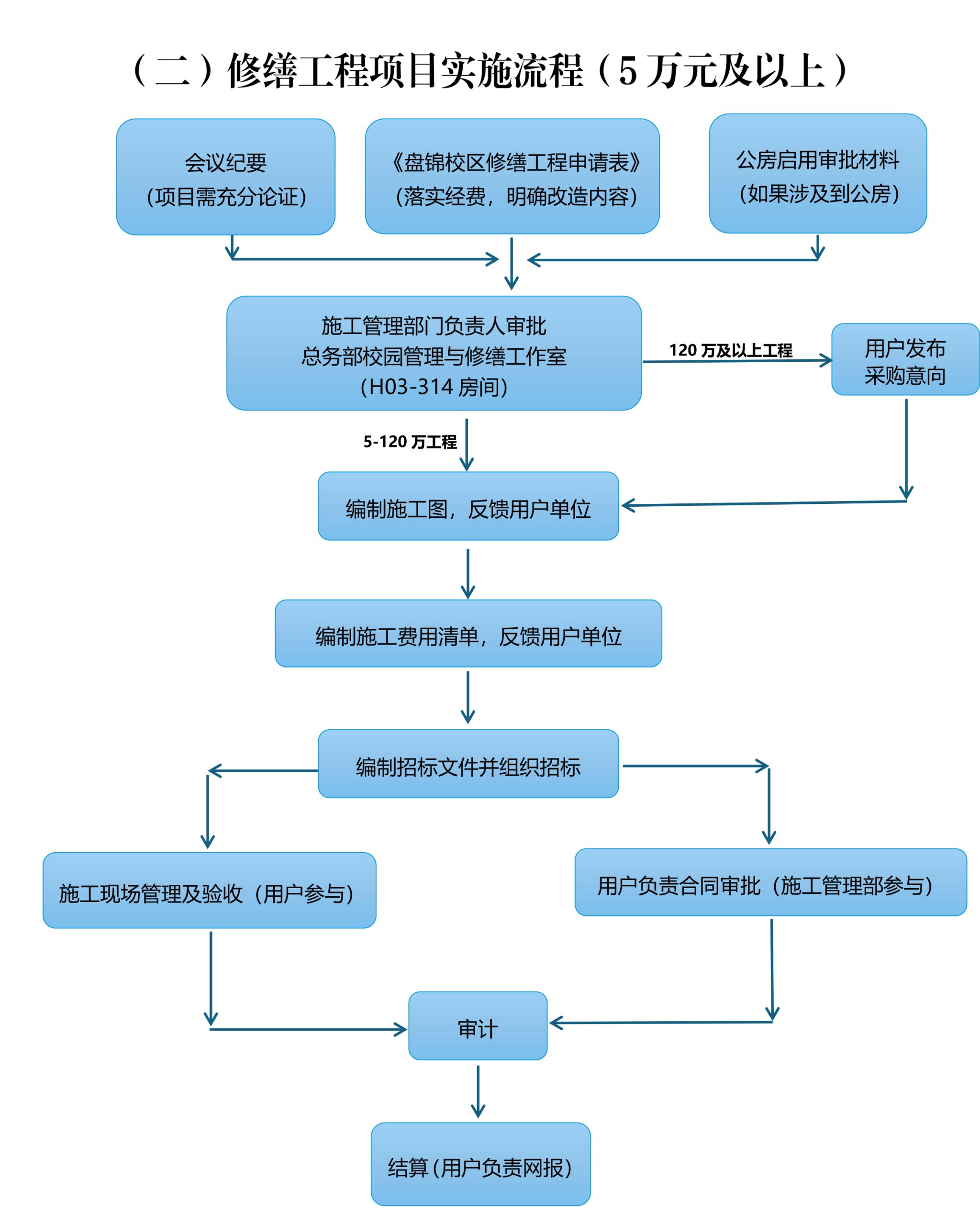 2. 工程预算5万元及以上,未达到学校集中采购限额(60 万元及以上)的修缮工程项目,由使用(管理)单位填写《大连理工大学盘锦校区修缮工程申请表》(附件2),由经费负责人审批并提前 1 个月提交总务部审批后,依据国家相关规定及《大连理工大学盘锦校区分散采购实施细则》组织采购程序,确定施工单位进行施工;